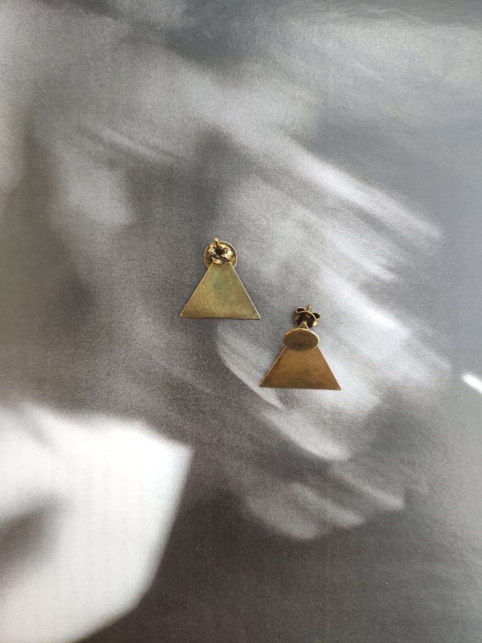 Brinco em metal no formato de triângulo nos banhos prata envelhecido e ouro envelhecido.