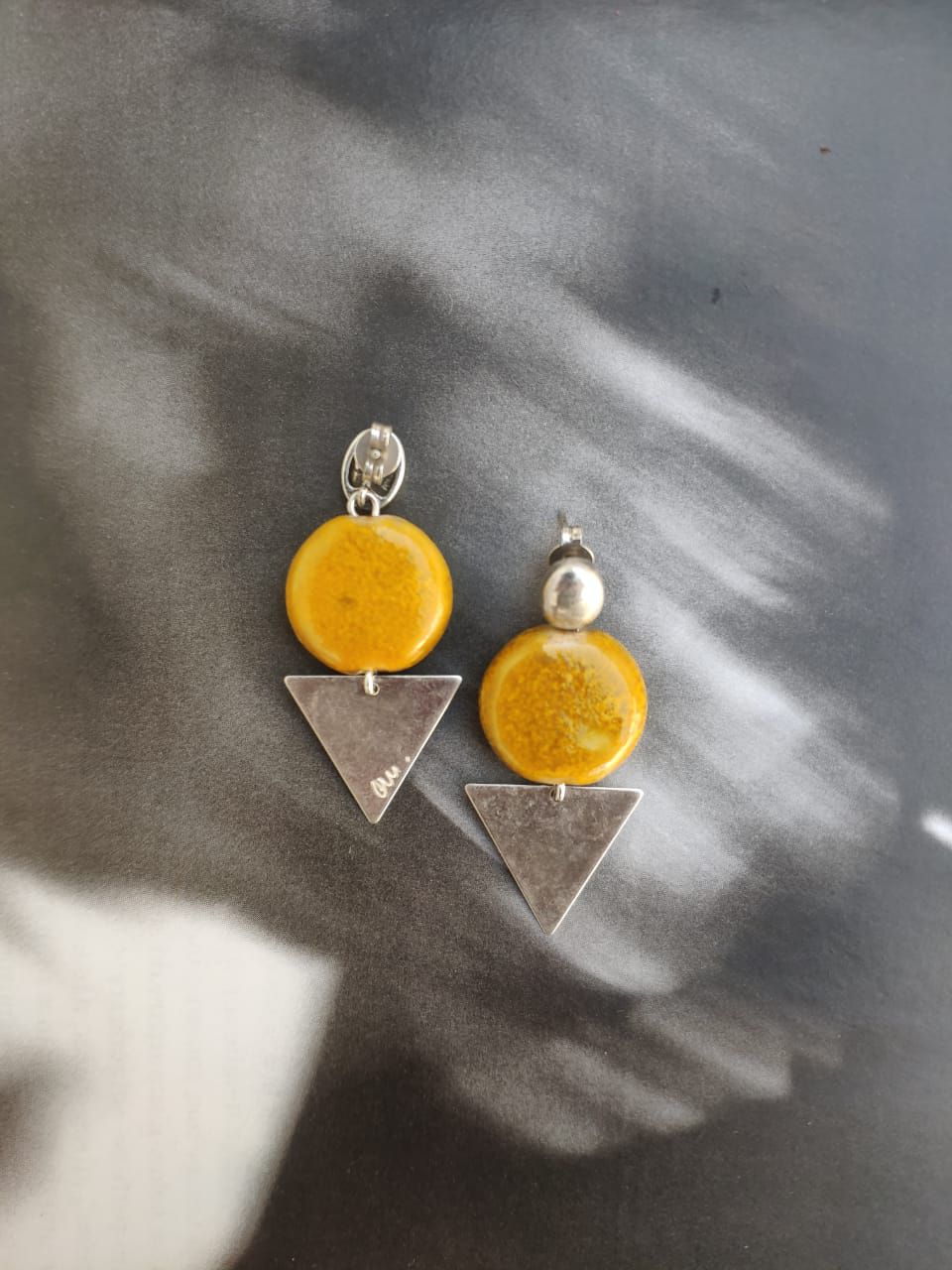 Brinco em metal nos banhos prata envelhecido e no ouro envelhecido, com peça em cerâmica e triângulo em metal.