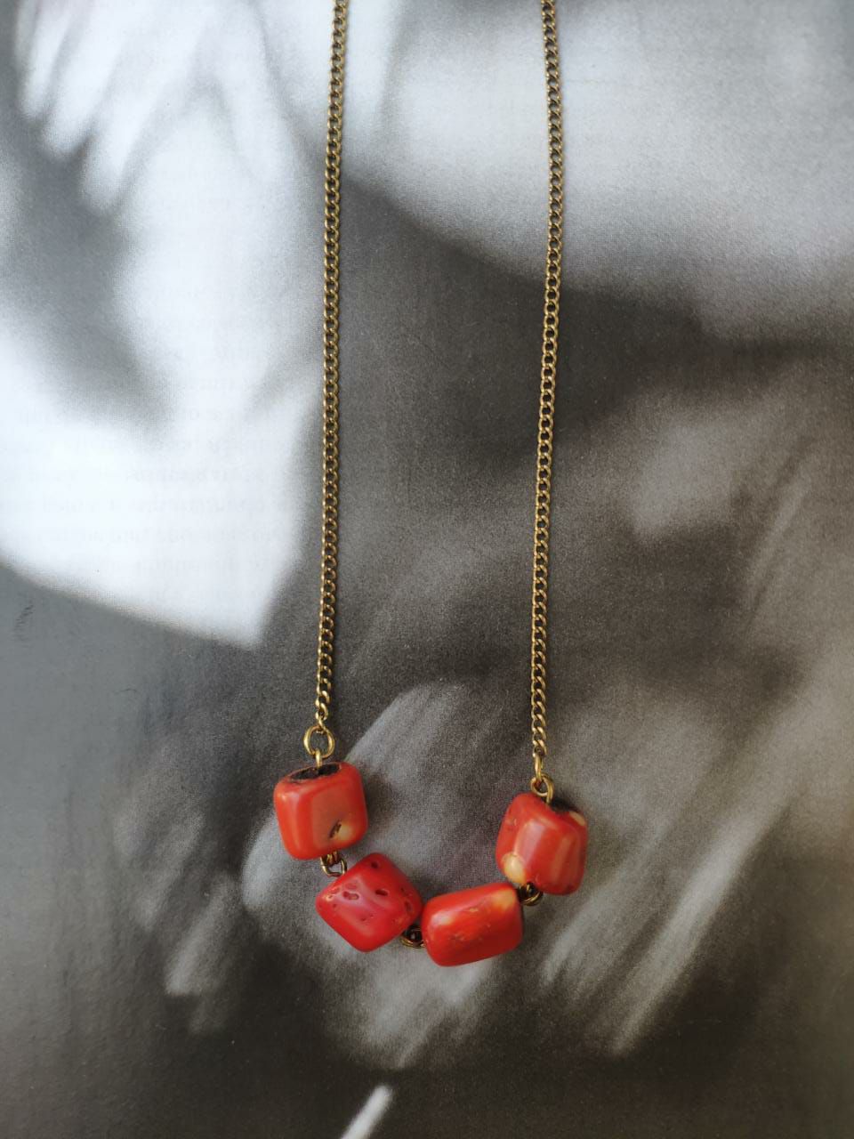 Colar nos banhos prata envelhecida e ouro envelhecido, em corrente trançada, fecho e pedras naturais coral.