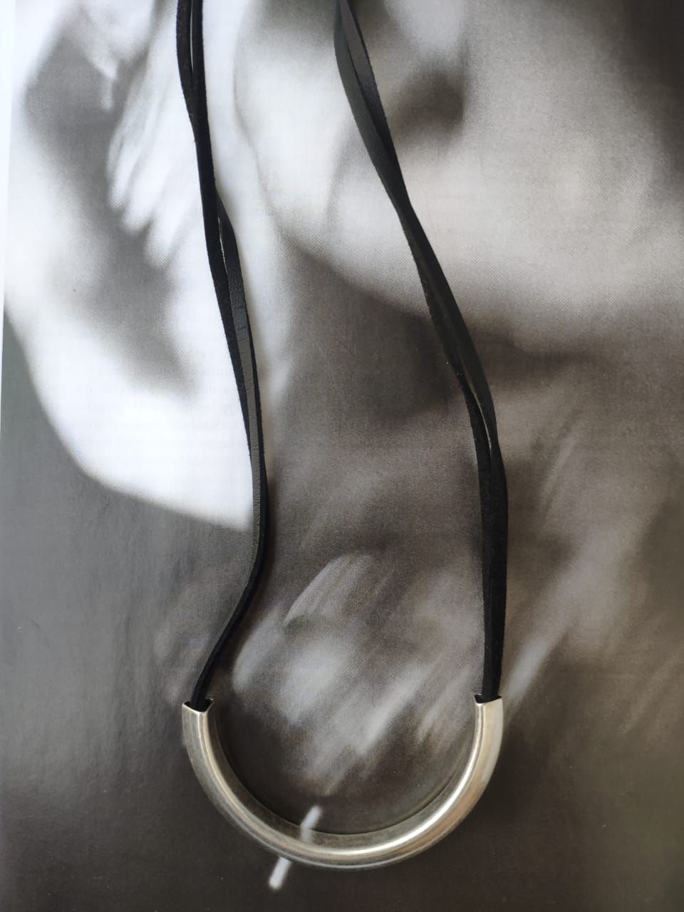 Colar em couro e peça em metal nos banhos prata envelhecida e ouro envelhecido.