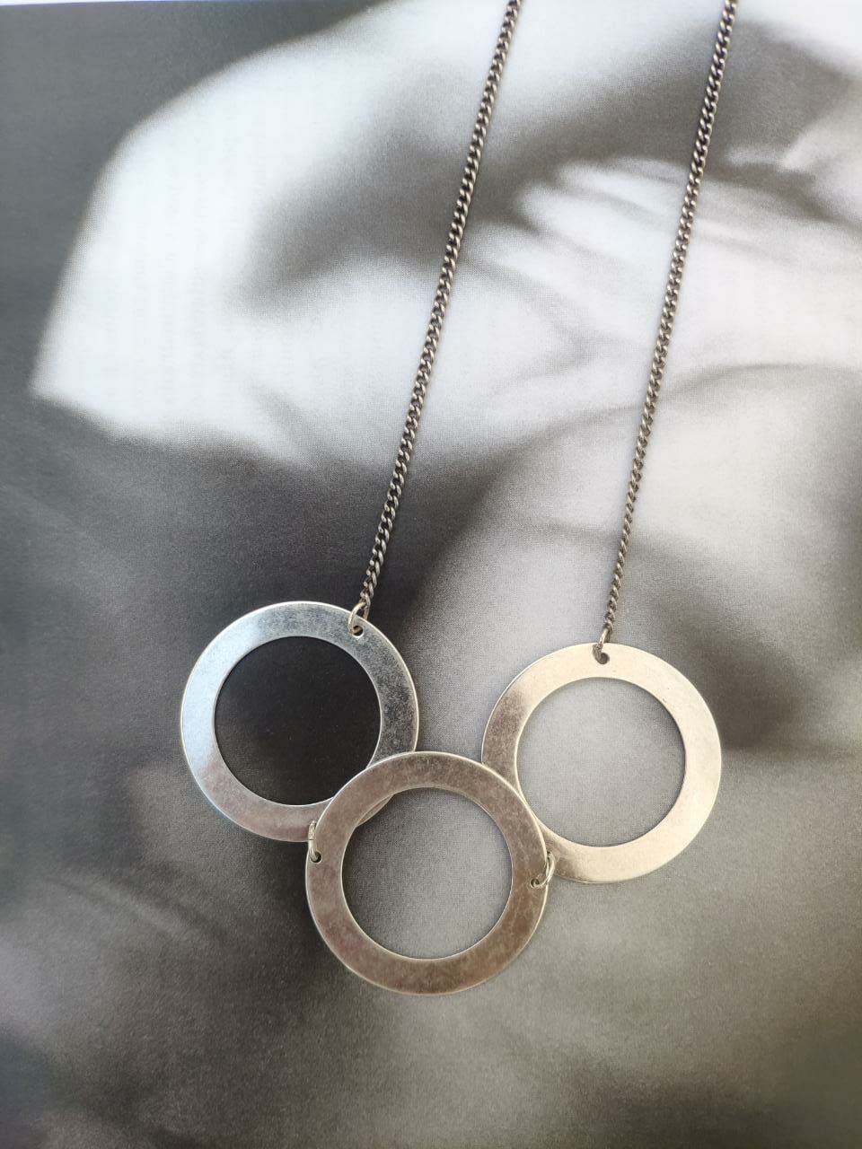 Colar corrente longa/fecho e três circulos vazados nos banhos prata envelhecido e no ouro envelhecido.