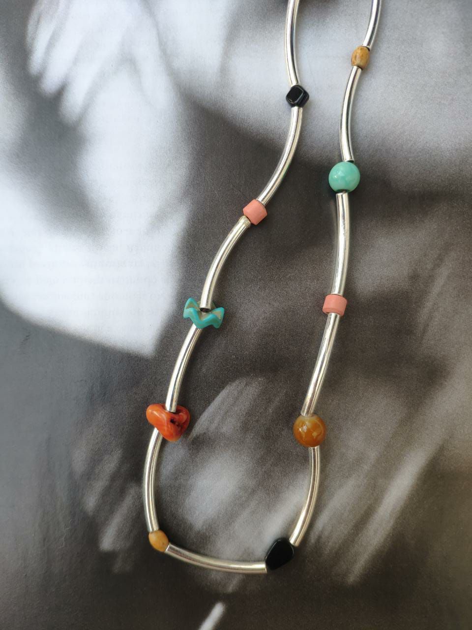 Colar com peças de metal nos banhos prata envelhecido e ouro envelhecido, com mix de contas .