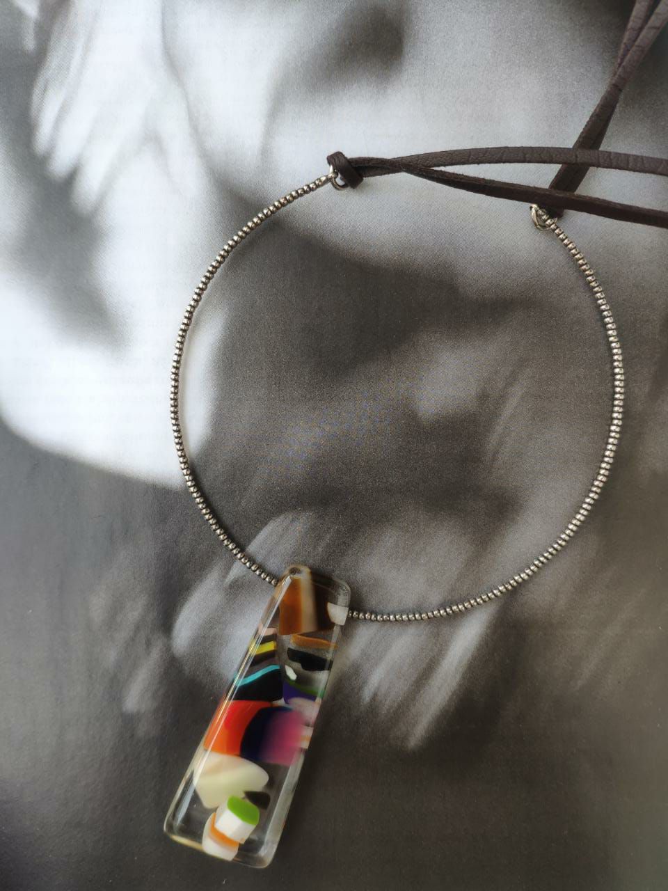 Gargantilha ajustável com couro e resina colorida.