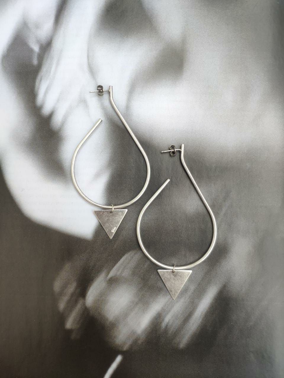 Brinco metal em banho de prata envelhecida/ouro envelhecido e pingente em formato de triângulo.