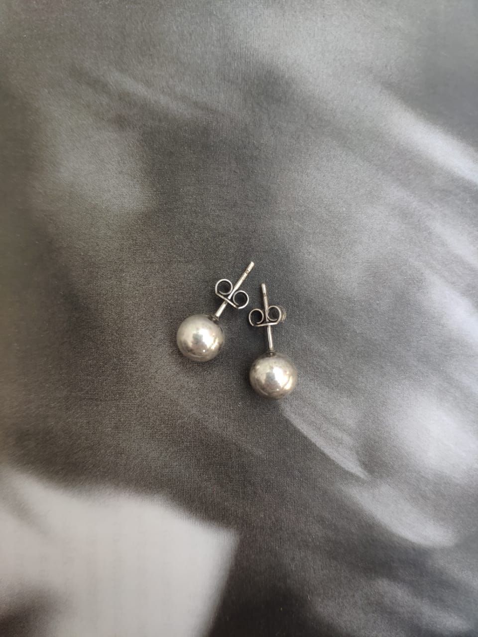 Brinco formato bola pequena em banho de prata envelhecido e ouro envelhecido.